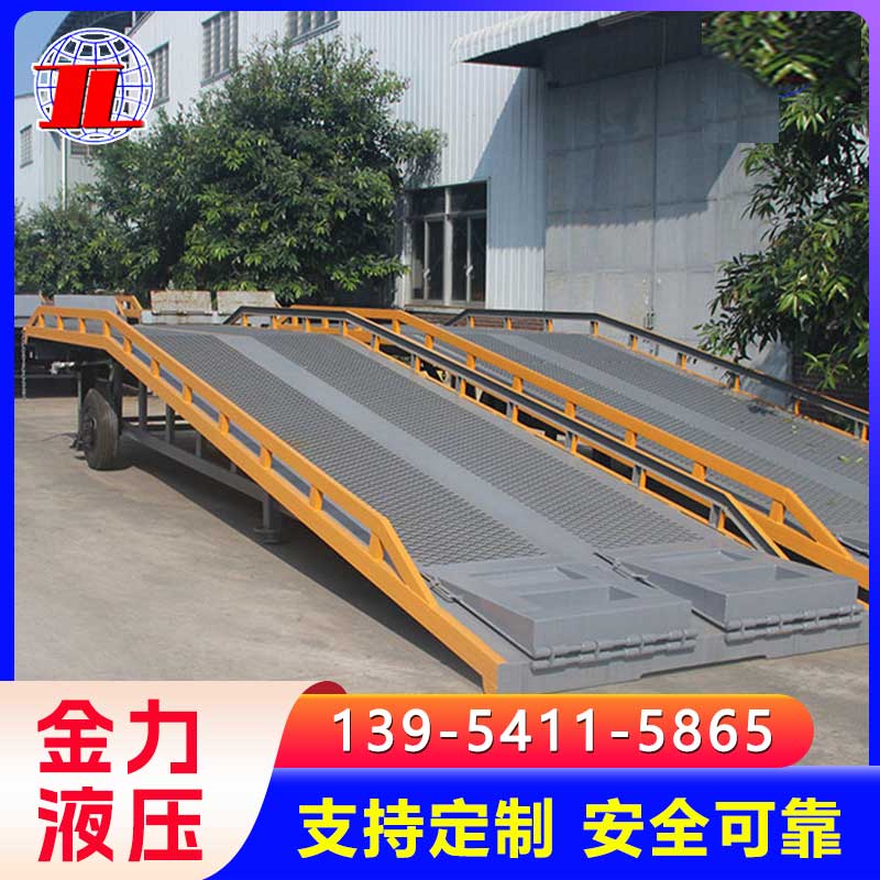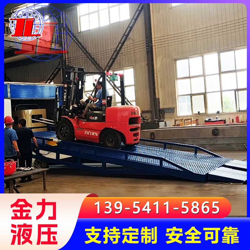 移动式登车桥广泛用于无装卸设备的货台及流动装卸场所,是与叉车配合使用的货物装卸辅助设备。借助移动式登车桥,叉车能直接驶入汽车集装箱内部进行批量装卸作业。只需单人操作,不需动力电源,即可实现货物的安全快速装卸